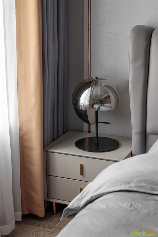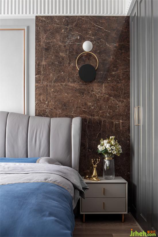 主臥設(shè)計(jì)的亮點(diǎn)在背景墻,一半是亮面,一半是軟包,家裝設(shè)計(jì)像對聯(lián)一樣,有著別具一格的對稱美。上聯(lián)是:瓷鏡與流光齊飛,下聯(lián)是:柔情共美夢同來。
