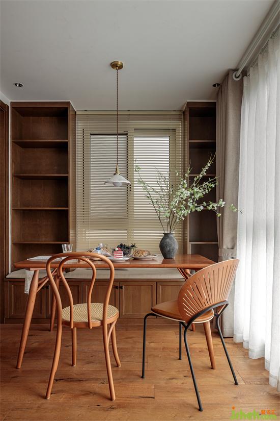并用原有的陽臺打造了卡座、餐邊柜等功能性設(shè)施。好友到訪時,可在這里用餐、閑聊、喝咖啡,玩狼人殺。家裝設(shè)計用餐時,既可享受美食的誘惑,又能坐擁窗外的風(fēng)景,實在是妙不可言。