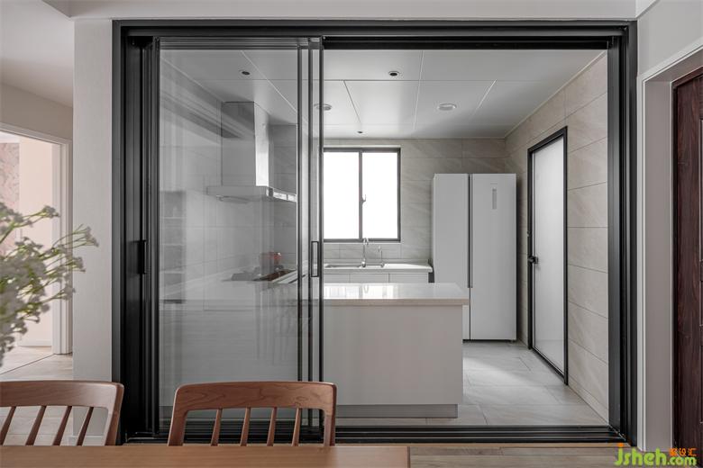 吧臺(tái)設(shè)計(jì)利用玻璃移門的開合,起到了功能區(qū)分的作用:關(guān)門時(shí)作為廚房的操作臺(tái),開門時(shí)作為和餐廳互動(dòng)的吧臺(tái),可休閑,可傳菜。