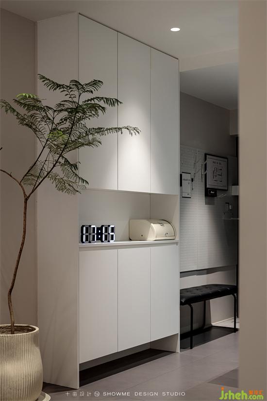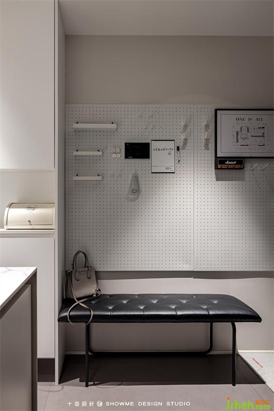 進門的縱深感很強,首先看到的是客廳的大窗戶,窗外的框景與室內(nèi)構(gòu)成完整和諧的視覺效果。右手邊是實用性很強的鞋柜、凳子、小件掛架,滿足回家放置物品的第一需求。