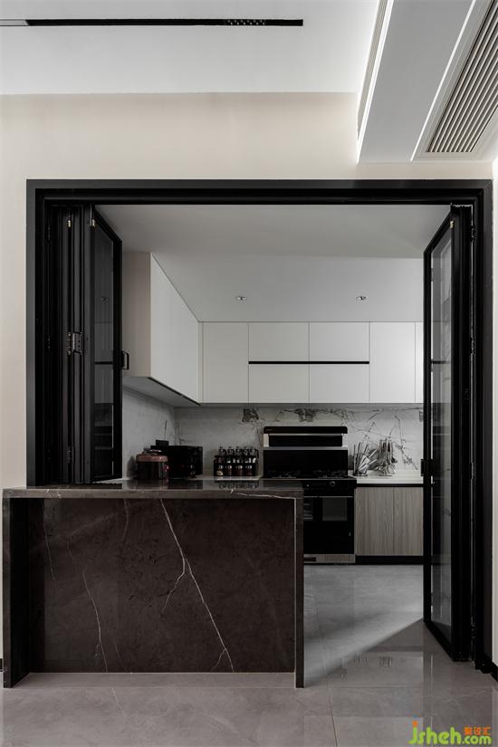 原空間布局單調(diào),缺乏創(chuàng)意,通過(guò)對(duì)屋主一家未來(lái)生活場(chǎng)景的了解和模擬,設(shè)計(jì)師重新規(guī)劃了動(dòng)線。家裝設(shè)計(jì)島臺(tái)一臺(tái)二用,既是廚房空間的重要輔助,也是與餐廳空間的顏值隔斷。
