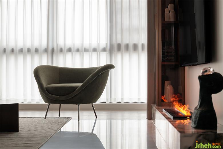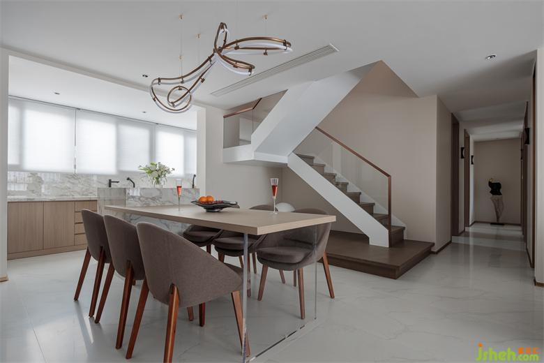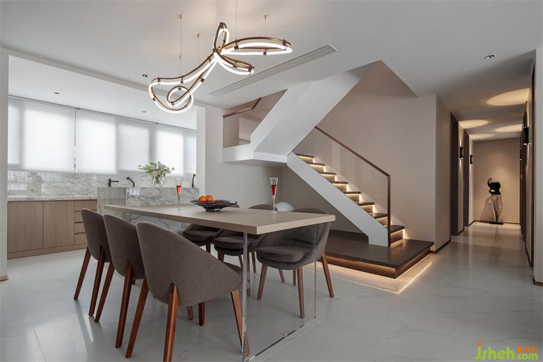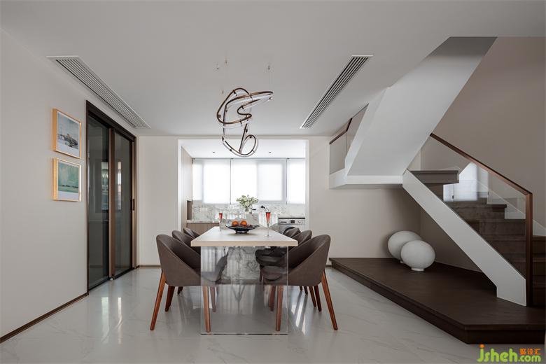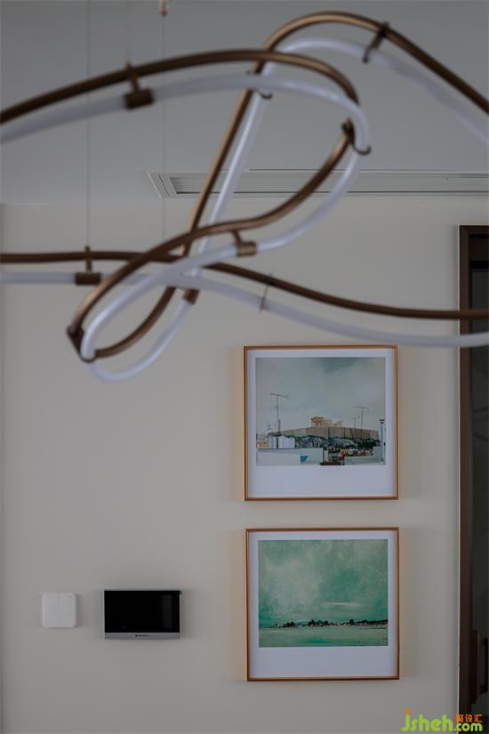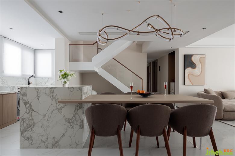 與客廳空間相互呼應(yīng),形成了良好的互動性。而曲線彎曲造型的吊燈讓橫平豎直的空間增添了一絲妖嬈,也體現(xiàn)出不俗的審美。