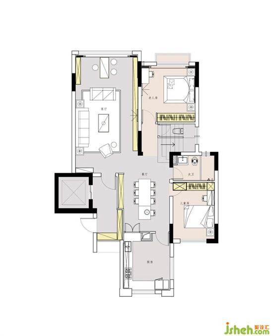 1.一樓空間要同時(shí)解決廚房采光差、空間狹小,位置居中、整個(gè)空間布局不合理等問題。