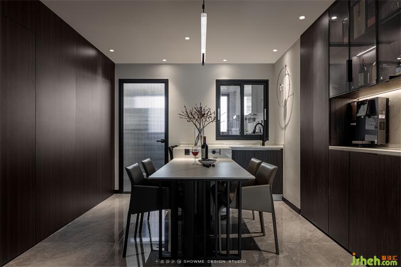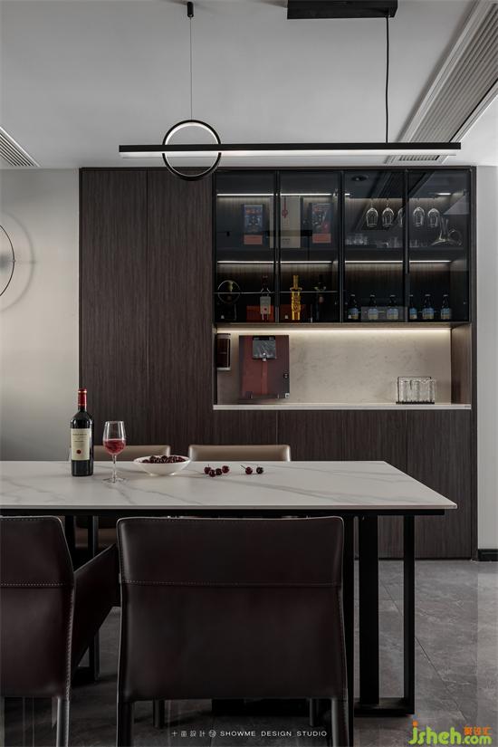 通過(guò)結(jié)構(gòu)調(diào)整,將廚房區(qū)域移動(dòng)至生活陽(yáng)臺(tái),金科王府家裝設(shè)計(jì)在原有位置打造出吧臺(tái)+餐廳的用餐區(qū),釋放空間,觀(guān)感上更顯開(kāi)闊。