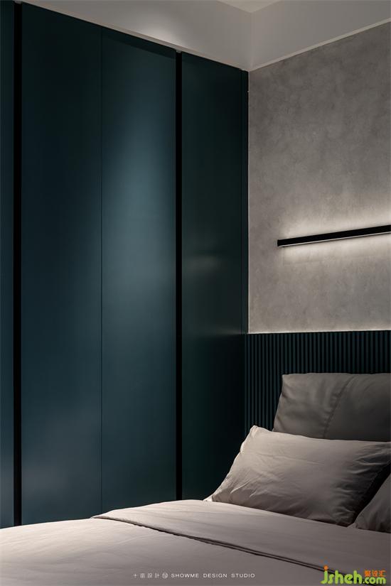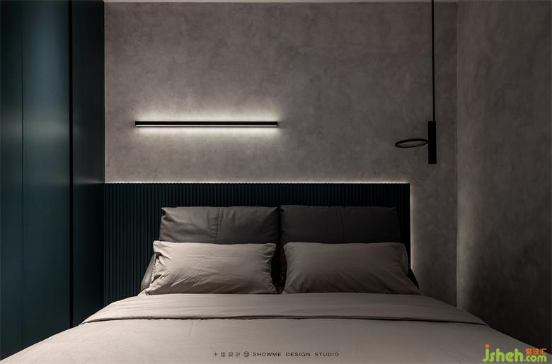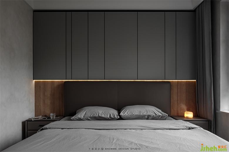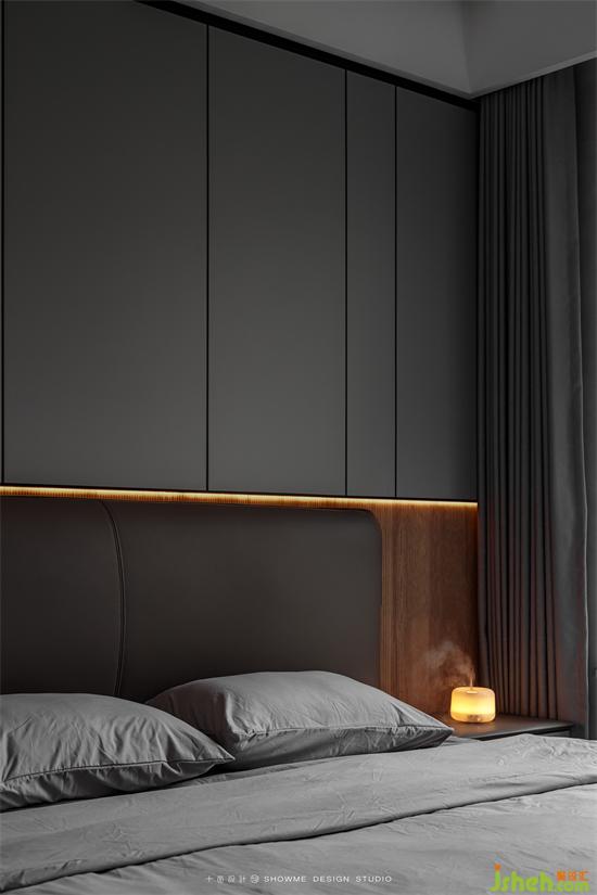臥室也保持了一以貫之的黑白灰風(fēng)格。木色背景板和簡潔流暢的線條設(shè)計是臥室的主基調(diào),內(nèi)江邦泰天著家裝設(shè)計沒有繁復(fù)的臥室吊燈,利用充滿設(shè)計感的燈帶帶來的柔光來營造溫馨舒適的氛圍。