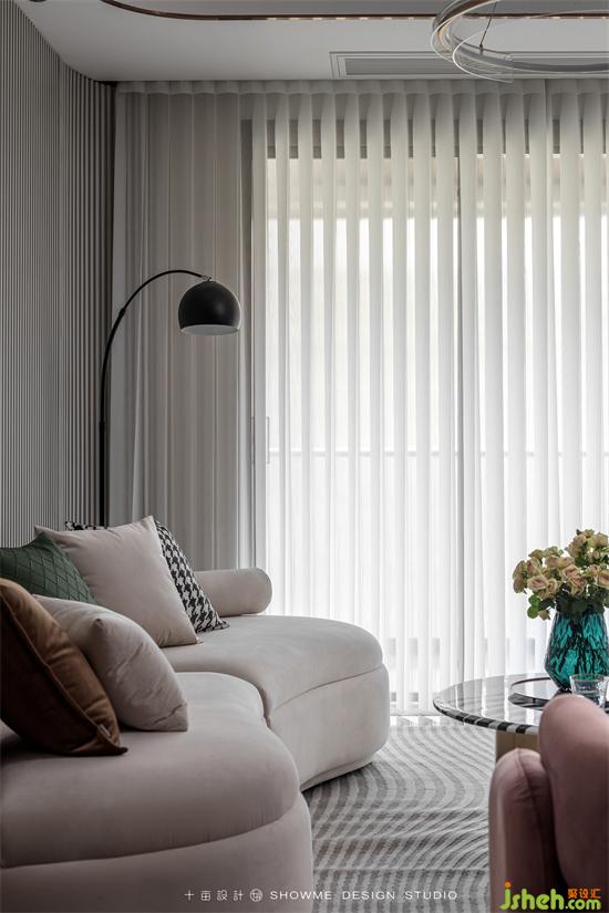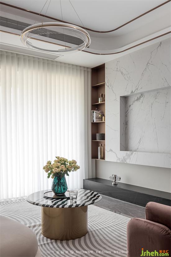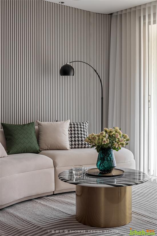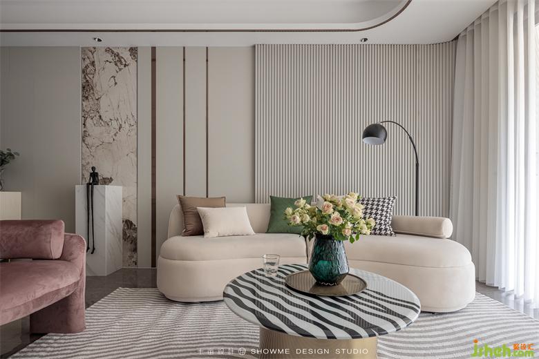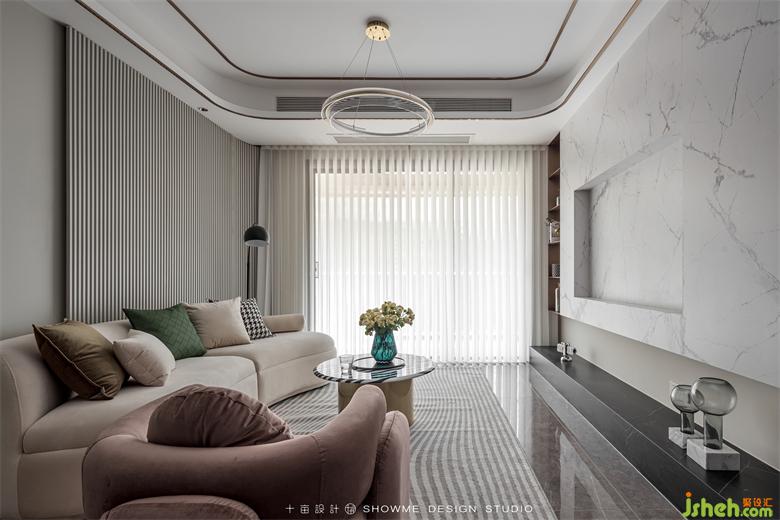 淺咖的底色基調(diào)讓空間治愈感滿滿,沙發(fā)背后大面積的墻面通過同色系的墻板、格柵、巖板搭配嵌入式燈光、金屬條,增加墻面層次的同時又不繁瑣,頤和上院家裝設計質(zhì)感、觀感、時尚感同步在線。