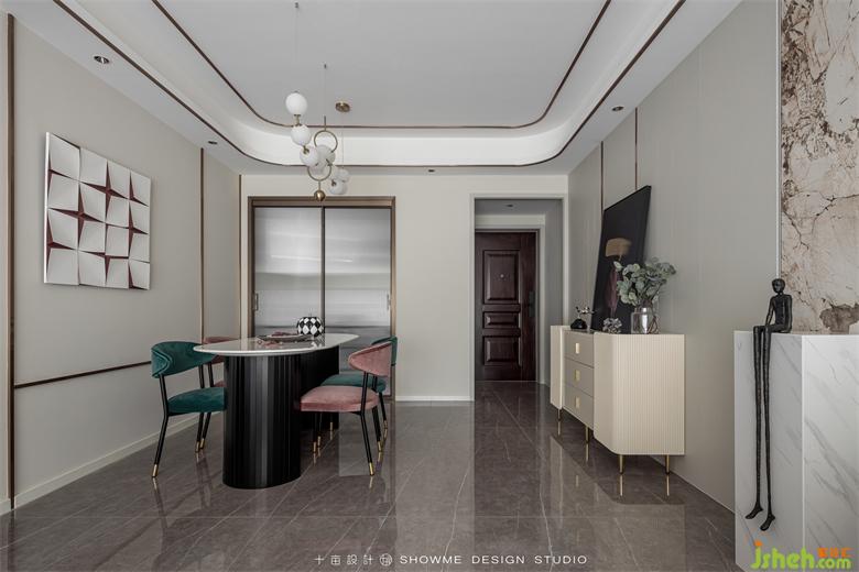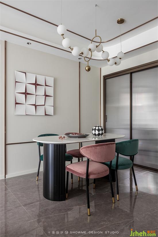 紅綠的椅子搭配經(jīng)典不過時,餐廳吊燈是這個空間最亮眼的存在,頤和上院家裝設(shè)計造型精巧,別致的白色餐桌在燈光的映射下,顯露出一種低調(diào)的奢華。