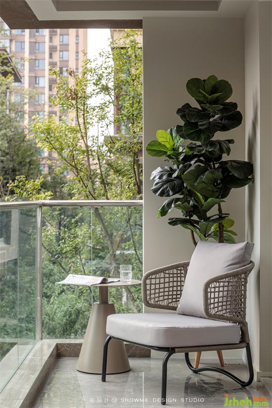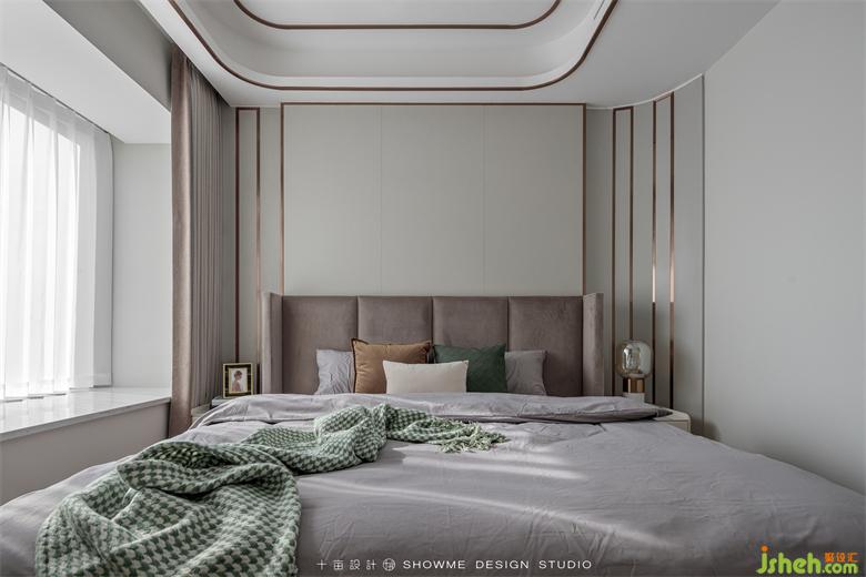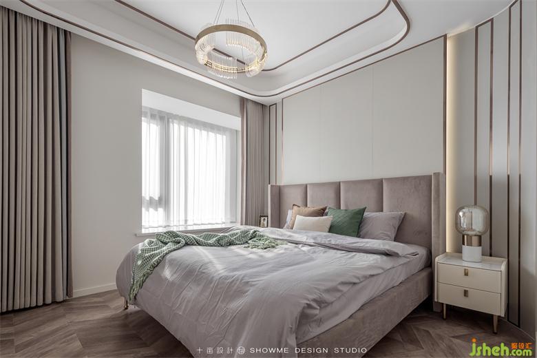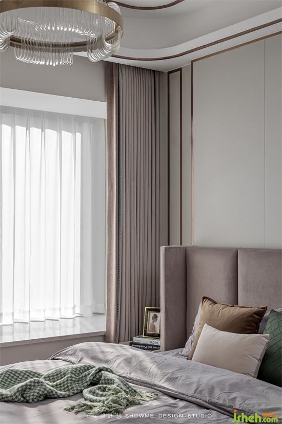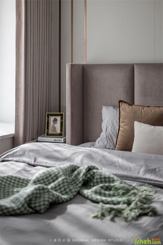 背景墻用曲面的暖灰色硬包讓空間更具延伸感和包裹性,增加空間柔和度,頤和上院家裝設(shè)計提高睡眠空間的溫馨氛圍。