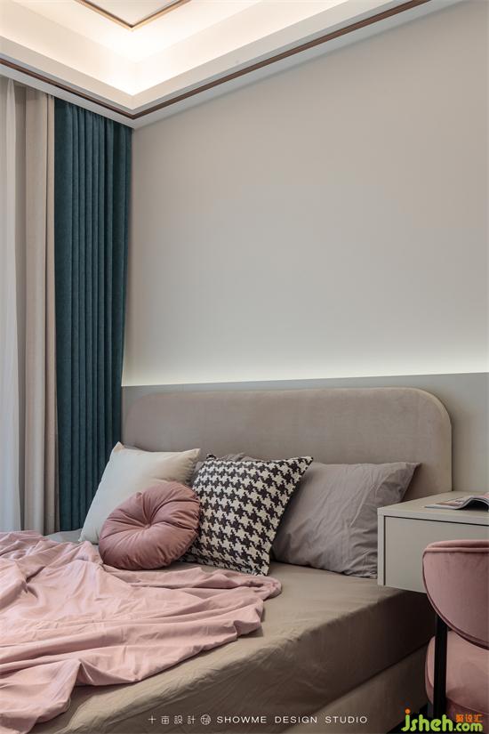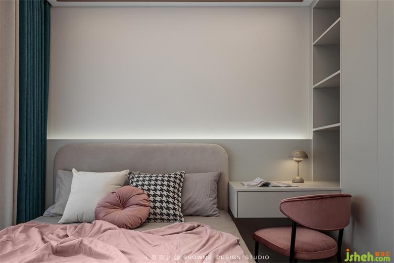 區(qū)別于主臥的整體墻面軟包,次臥選擇半墻軟包以達(dá)到視覺(jué)分層的效果。定制柜上墻的優(yōu)點(diǎn)明顯,既節(jié)省了空間,又可以做到一柜多用。