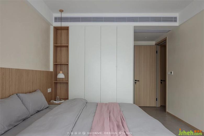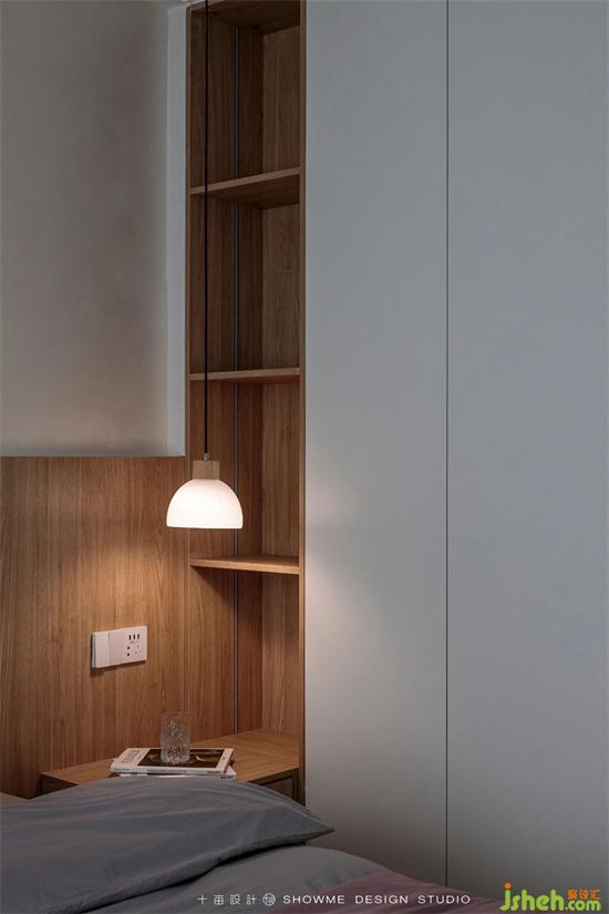 定制衣柜靠床頭的位置貼心地設(shè)計(jì)為鏤空格欄狀,方便收納取拿各種生活物件。