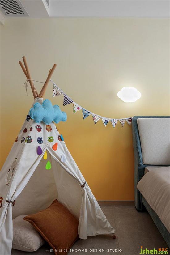 兒童房的風(fēng)格充滿了童趣,云朵形狀的壁燈像極了小朋友奇幻的夢(mèng)想,印第安小帳篷是小朋友最愛(ài)的游戲空間,國(guó)賓上院家裝設(shè)計(jì)彩色衣柜扣點(diǎn)綴出五顏六色的童話故事,而一切的一切,都源于爸爸媽媽滿滿的愛(ài)。