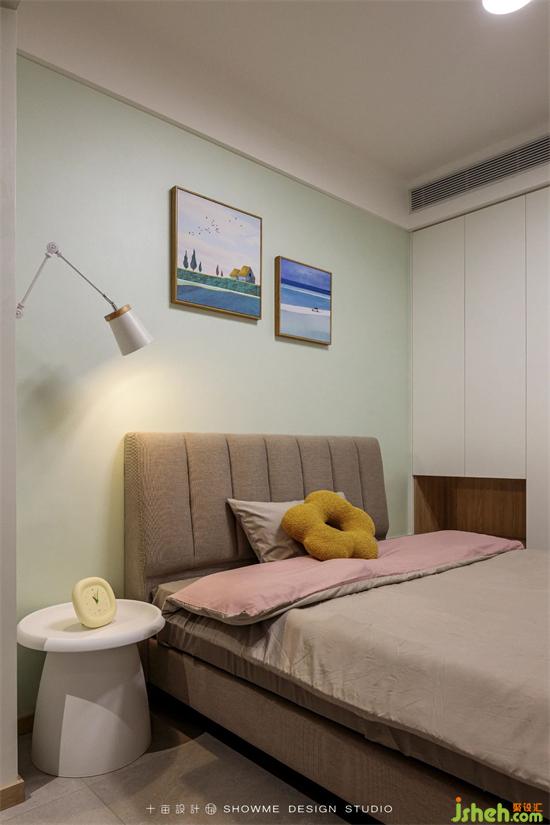 次臥采用綠色藝術(shù)漆作為床頭裝飾,色彩搭配更加清新,國(guó)賓上院家裝設(shè)計(jì)加上圓形床頭燈和白色圓形蘑菇床頭柜,增添了可愛(ài)活潑的色彩。
