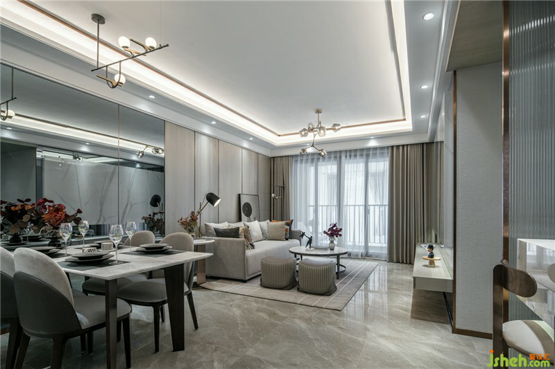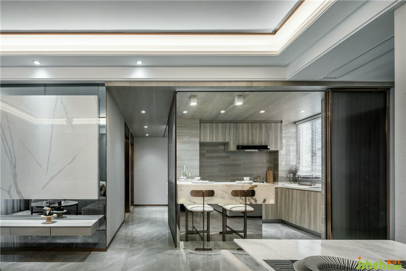 同時(shí)將廚房吧臺(tái)與衛(wèi)生間臺(tái)面連為一體,搭配天花造型的變化,形成區(qū)別于客餐廳的第二公共活動(dòng)區(qū)域。樣板房設(shè)計(jì)