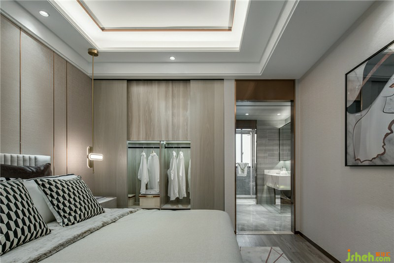時(shí)尚典雅色調(diào)的主臥室鋪述溫馨舒適氛圍,描述著安眠的環(huán)境情景;空間內(nèi)無雕飾,而是發(fā)揮原建筑的條件,利用窗外自然景觀設(shè)置化妝臺(tái)兼為書桌;由于空間的局限性,主臥借用部分兒童房空間作為衣柜空間,上方為兒童房的床的空間;在簡(jiǎn)明敞朗中,回歸生活與休息的真諦。樣板房設(shè)計(jì)