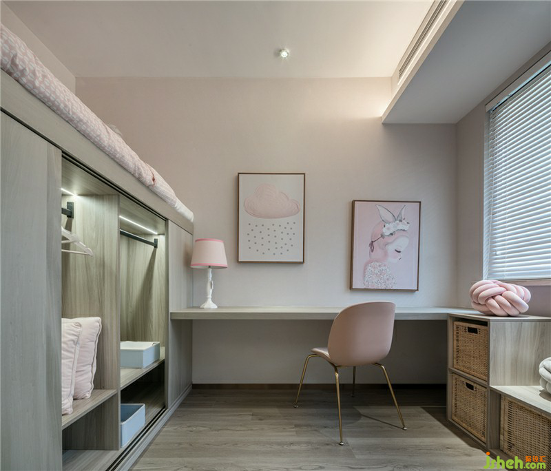 兒童房的設(shè)計(jì)以粉調(diào)為主,空間功能設(shè)計(jì)上將書桌作為上床的踏面,先通過兩踏臺(tái)階上到書桌,再直接爬上夾層的休息空間,床的下方1200mm深度,分為兩處衣柜,一般借給主臥空間,一半作為兒童房衣柜;整體設(shè)計(jì)上功能性為先,增加一定的趣味性。樣板房設(shè)計(jì)