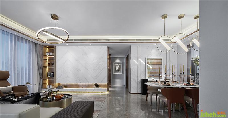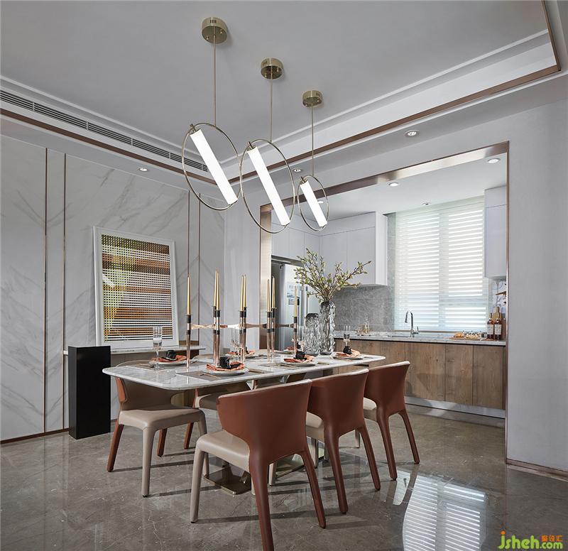 客廳空間的設(shè)計(jì),通過塊面和線條的塑造使其更具包容性。天花設(shè)計(jì)不銹鋼疊級與墻面豎向的不銹鋼收邊,突顯了空間的層次感與立體感。白色大理石增設(shè)嵌入式展示柜,使空間更為整體大氣。
