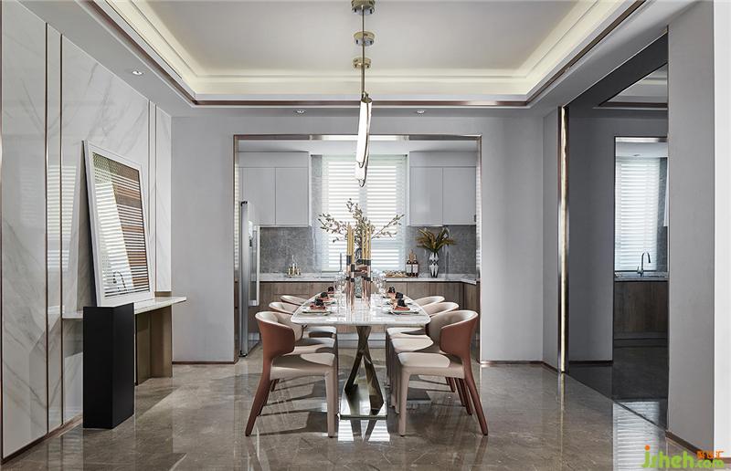 餐廳雅灰度的色彩與白色搭配,虛與實(shí),抽象與具象,空間營造了靜謐而深遠(yuǎn)的觀感。