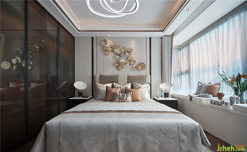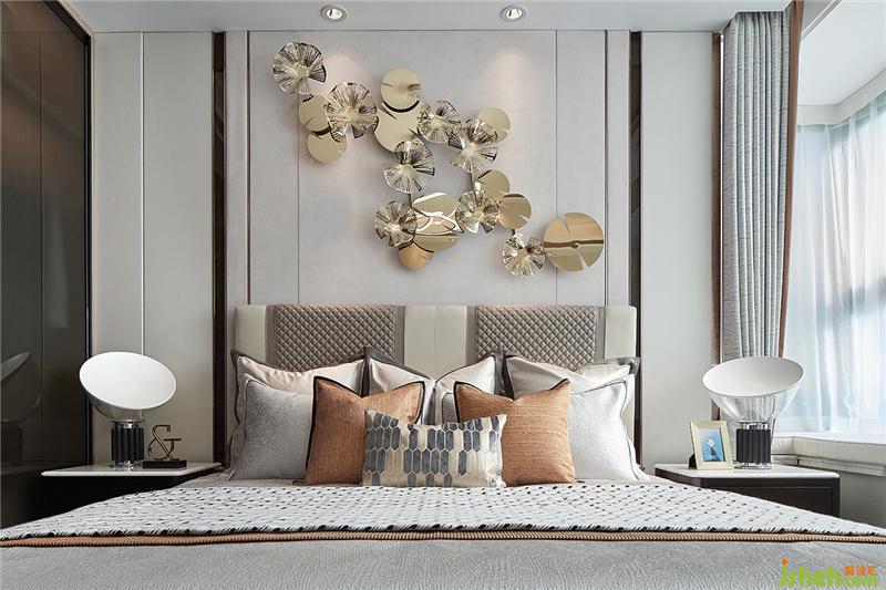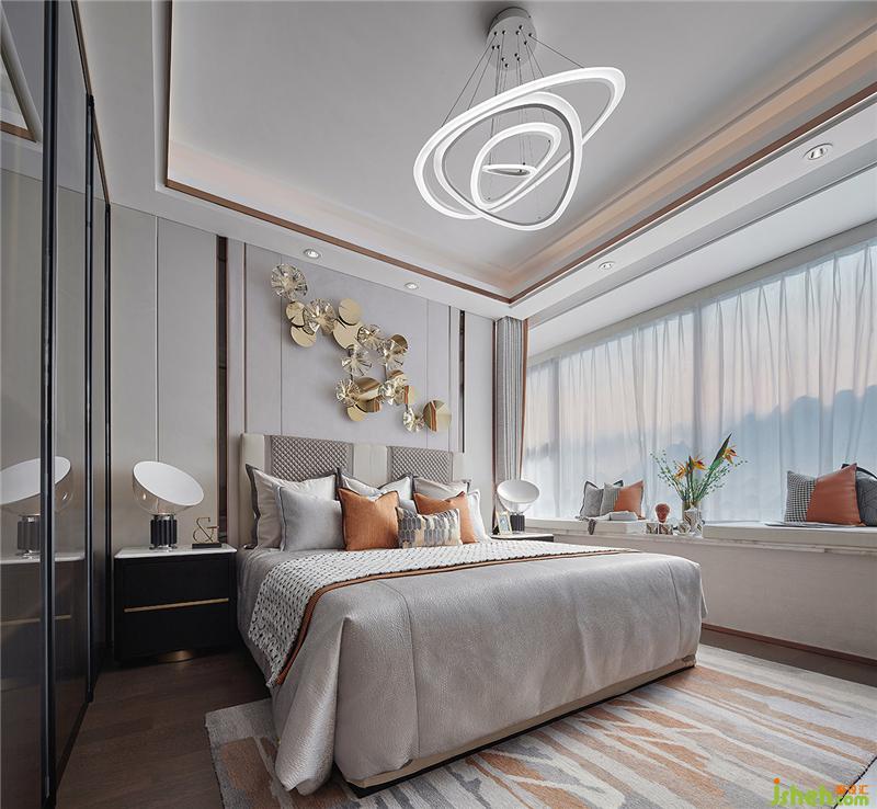 主臥延續(xù)公共空間的典雅,灰白橙的相互交融,營造空間的氣質(zhì),墻上造型獨(dú)特的藝術(shù)飾品在相對簡約的空間里有了可品的細(xì)節(jié),床品與軟飾的質(zhì)感細(xì)膩不凡,匹配主人房的格調(diào)與定位。樣板房設(shè)計(jì)