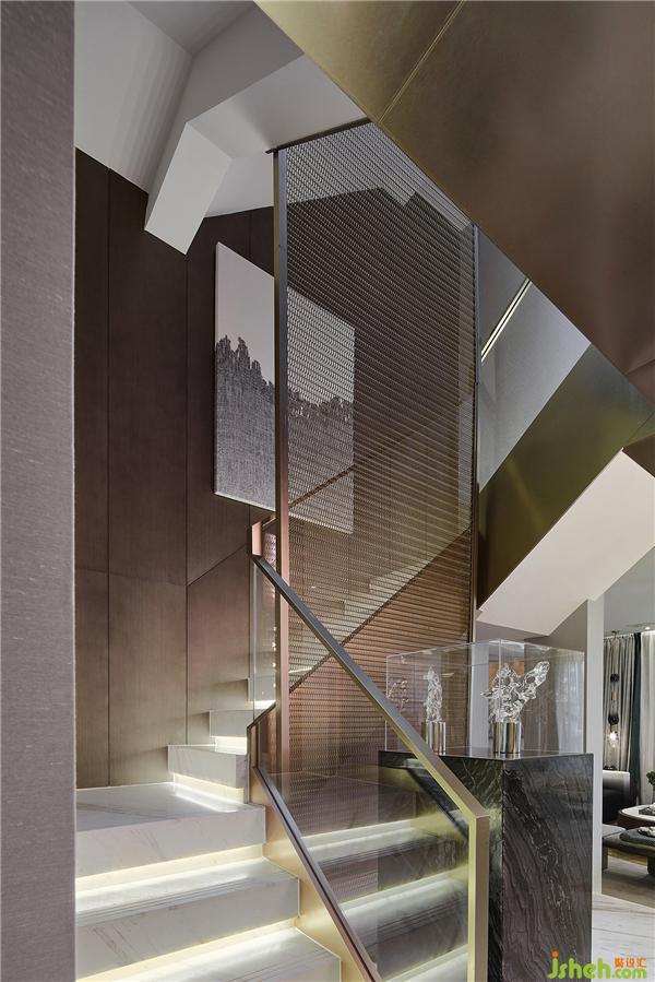 樓梯裝置以通頂金屬網為隔斷,視線未被完全阻隔,客餐廳與景觀陽臺隱約窺見。整個門廳收放有序,以東方理念的當代演繹,將喧囂褪去,讓所有感官在靜謐中自由舒緩。
