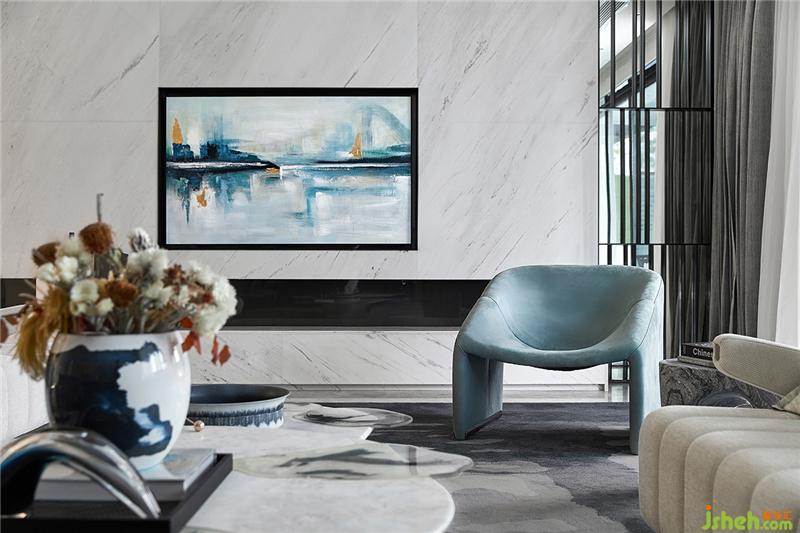 一層客廳的空間設(shè)計(jì)中強(qiáng)化了挺直的線條感,散發(fā)出嚴(yán)謹(jǐn)與端莊,墻面的大理石紋烘托低調(diào)奢華的品質(zhì)。在陳設(shè)設(shè)計(jì)上,通過(guò)挺闊的輪廓線條和大氣的造型呼應(yīng)并加強(qiáng)了感性的審美。