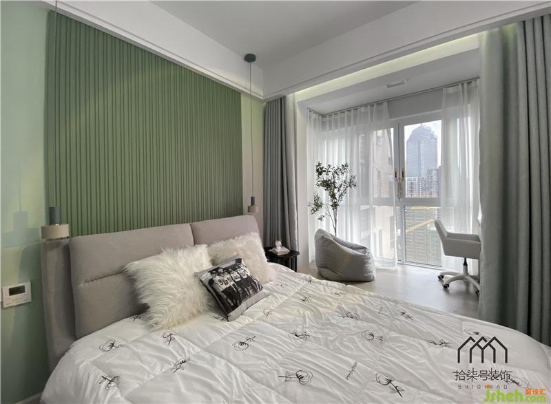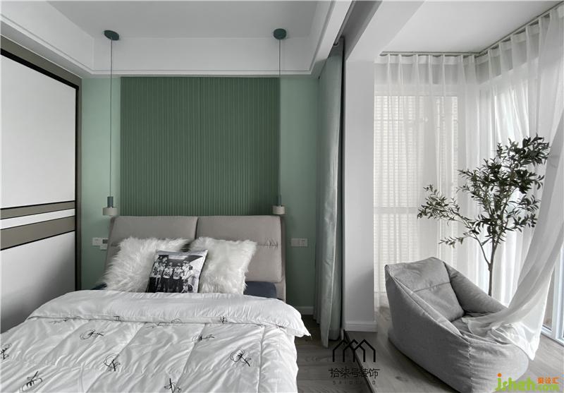 重彩的蔻梢綠的墻面和白色相接,視覺(jué)分割出詩(shī)意的韻味。在愜意夢(mèng)境之后的清晨醒來(lái),窗外幾縷溫暖陽(yáng)光,透過(guò)紗窗照射進(jìn)來(lái),冒著時(shí)髦靈動(dòng)的氣質(zhì)。房間內(nèi)的生活情愫刻畫(huà)的栩栩如生。