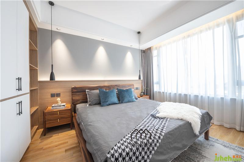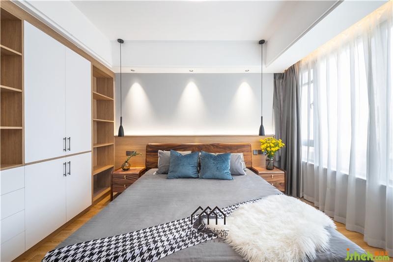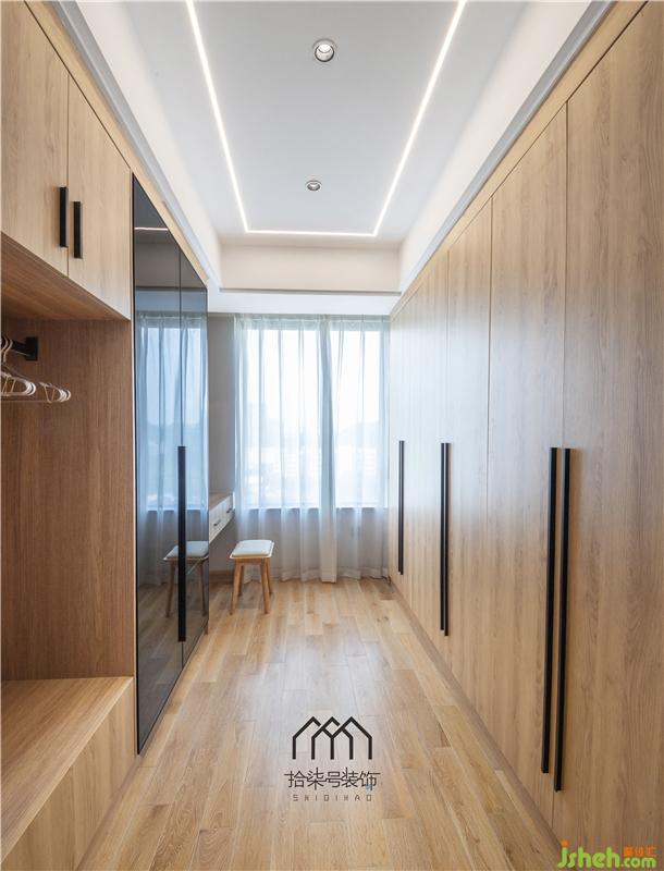 柳州家居裝修半開(kāi)放衣柜,原木色簡(jiǎn)約內(nèi)斂,白色柜門(mén)作為留白空間干凈視覺(jué)舒暢。原木色的拼版背景墻搭配更深的胡桃木,材質(zhì)相同效果卻層次分明