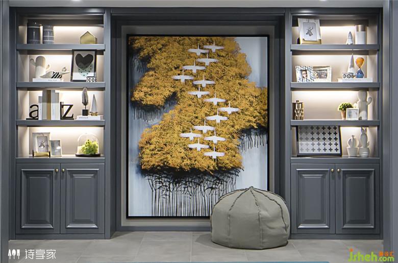 △ 深深淺淺的灰色室內(nèi)設(shè)計師打造出層次感,明黃和湛藍(lán)讓空間更靈動,精致的展柜,收錄著美好生活的小片段