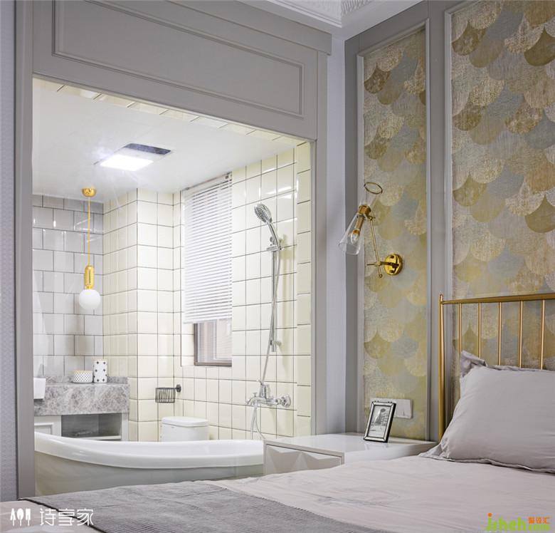 主臥套房室內(nèi)設(shè)計師采用鋼化玻璃取代一部分墻體,使得原本小而暗的衛(wèi)生間顯得明亮通透。