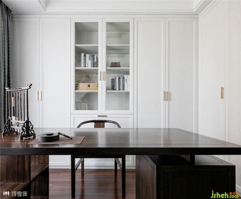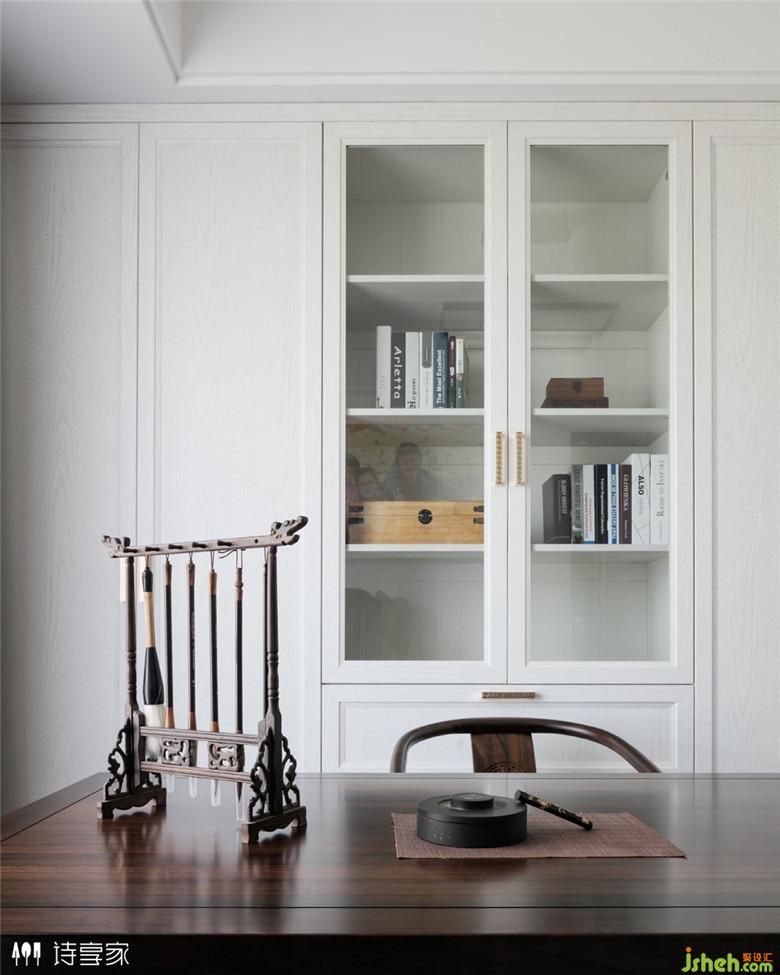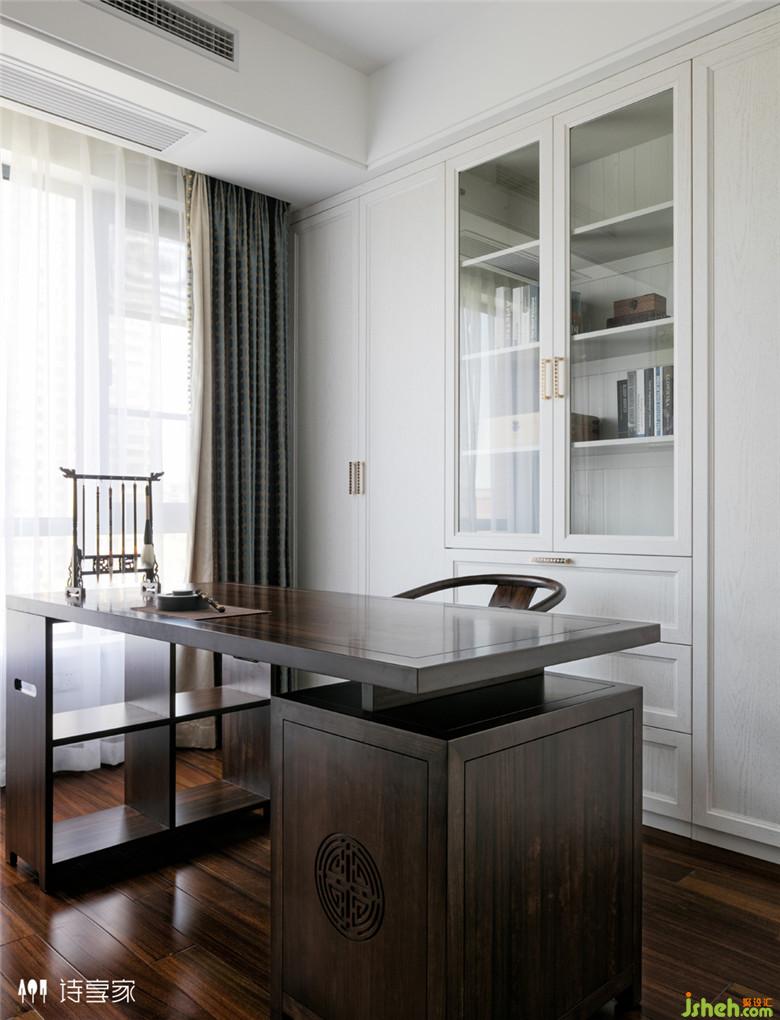 整個設(shè)計(jì)以白色和深胡桃色為主,搭配了白色的石材,讓整個空間更加豐富和層次感。地面采用水泥色的地磚,與深胡桃墻面的結(jié)合有一種古色古香的韻味。用現(xiàn)代感的金屬線條與質(zhì)樸的中式相碰撞,擦出不一樣的火花。