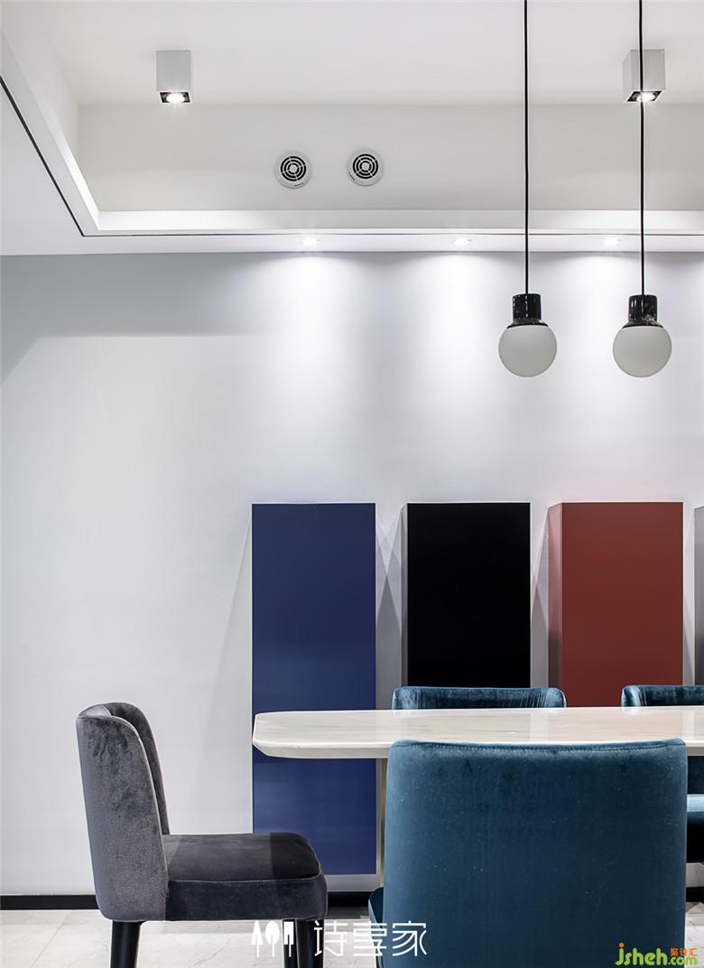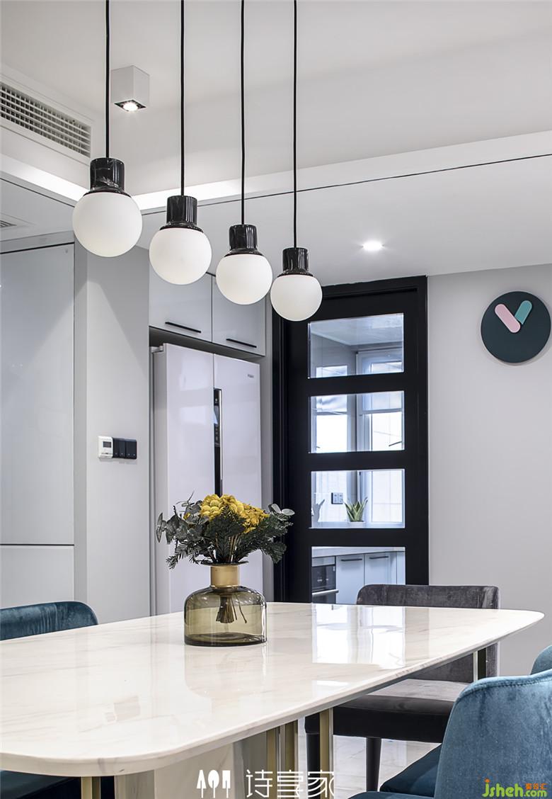可愛的掛鐘,溫暖的球形燈,彩色的柜體,消除了現代風的冷淡感,憑添幾分童趣,綠植更為空間增添了勃勃生機。
