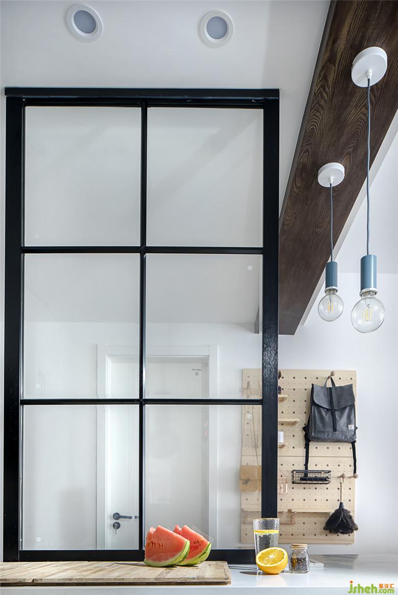 玄關(guān)原本是半開放式的,為了讓空間更開闊,室內(nèi)設(shè)計師把玄關(guān)和廚房還有客餐廳融為一個空間,并且把鞋柜和廚房的臺面區(qū)域做成了一個整體,中間用玻璃隔斷,采光更好,收納空間也更加整潔。