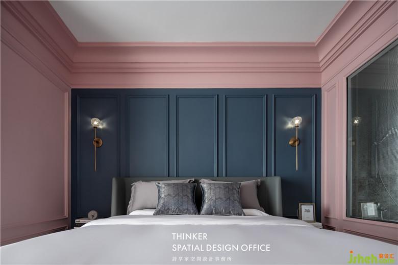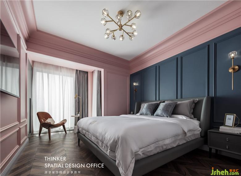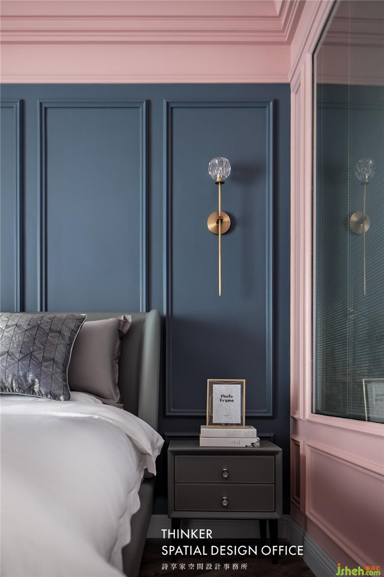 室內(nèi)設(shè)計(jì)師以灰粉色墻面包裹臥室,柔軟而溫和,床頭內(nèi)斂的灰藍(lán)色,又為空間注入沉穩(wěn)安靜的氣息,魚骨拼地板更帶來法式的優(yōu)雅。好好睡覺,很重要。
