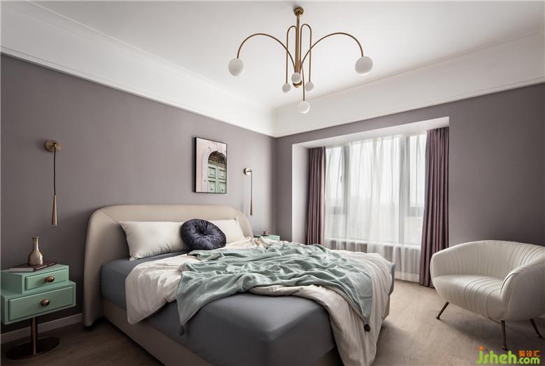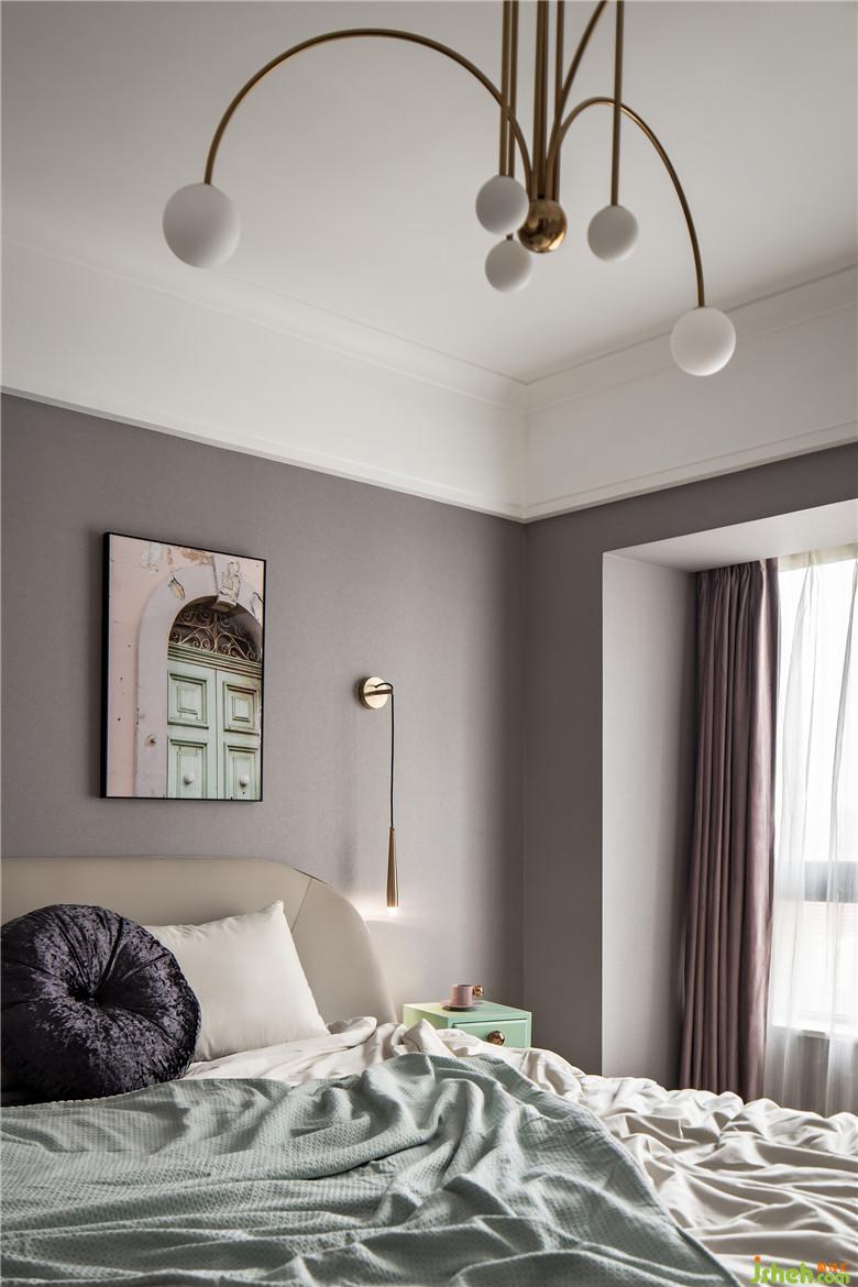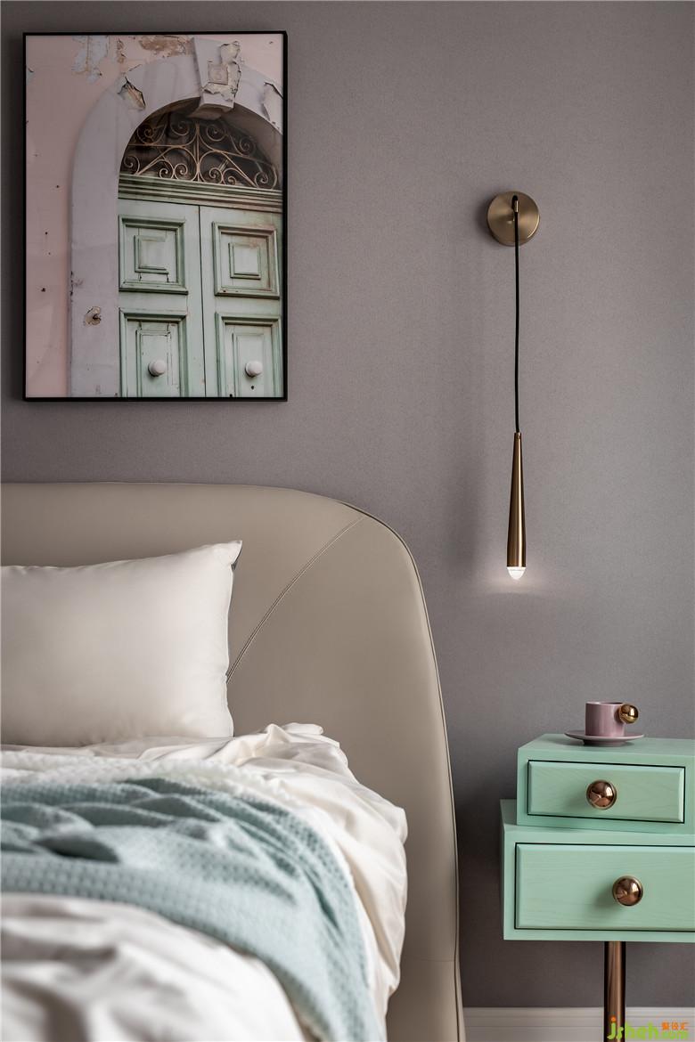 · 線性吊燈,圓潤(rùn)的床頭,薄荷綠的床頭柜造型有趣,還能與裝飾畫的顏色相呼應(yīng),豐富的“非傳統(tǒng)”造型元素,可愛又精致。