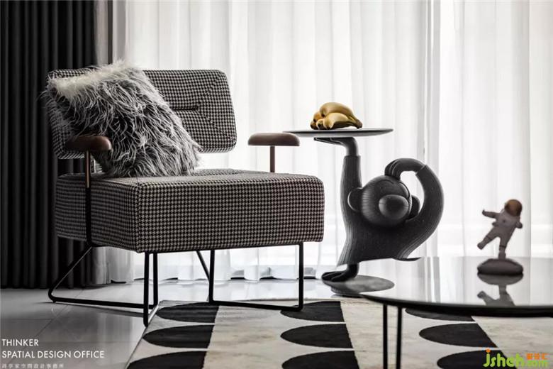 千鳥(niǎo)格的方糖沙發(fā),給人一種可鹽可甜的美感,北歐猴子托盤(pán)茶幾,讓藝術(shù)在空間游走,兩者形成摩登而時(shí)尚的畫(huà)面。