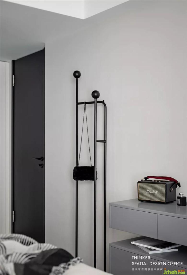 臥室延續(xù)了光影的運(yùn)用,籠罩著一層隱約的朦朧。灰色調(diào)的巧妙應(yīng)用,利用它獨(dú)有的模糊性和調(diào)和性的屬性,使得那些純正色彩分隔地帶的過渡顯得如此自然和諧。