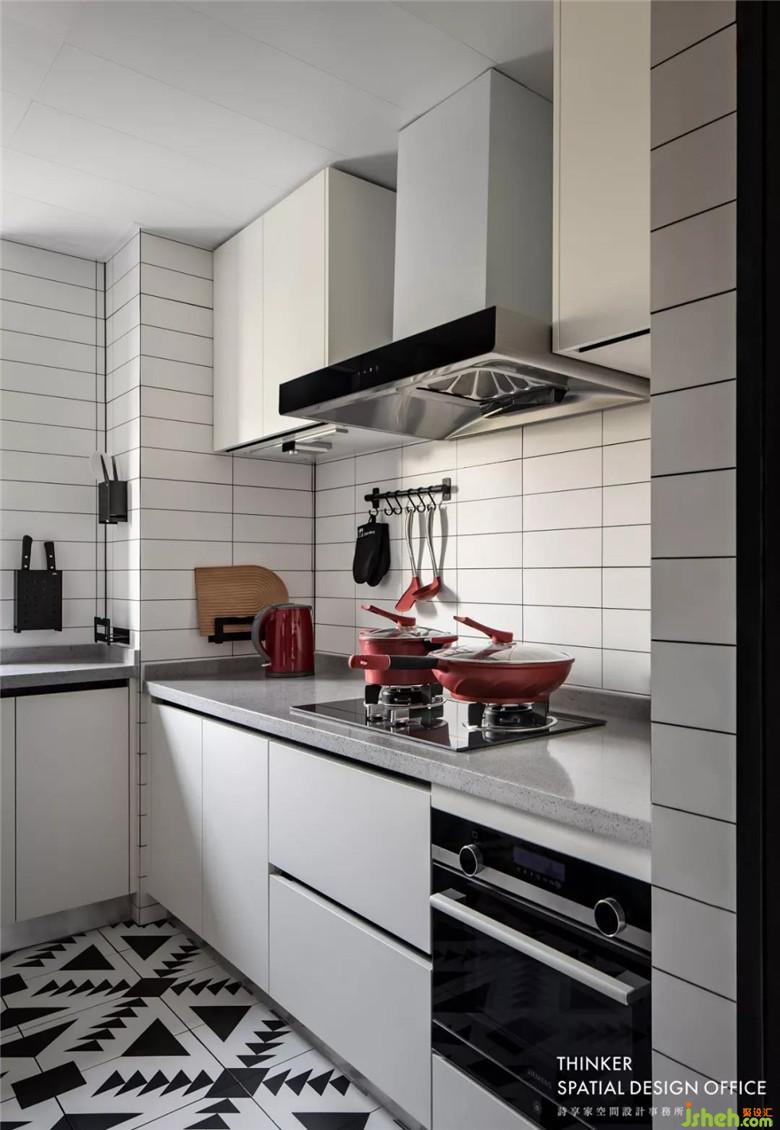 廚房,設(shè)計(jì)師亦精心將其刻畫成簡單利落的空間表情,拋棄華而不實(shí)的裝飾,鋪排出流暢動線構(gòu)造出的敞亮空間,白色的櫥柜更是將廚房襯托得更加清凈。