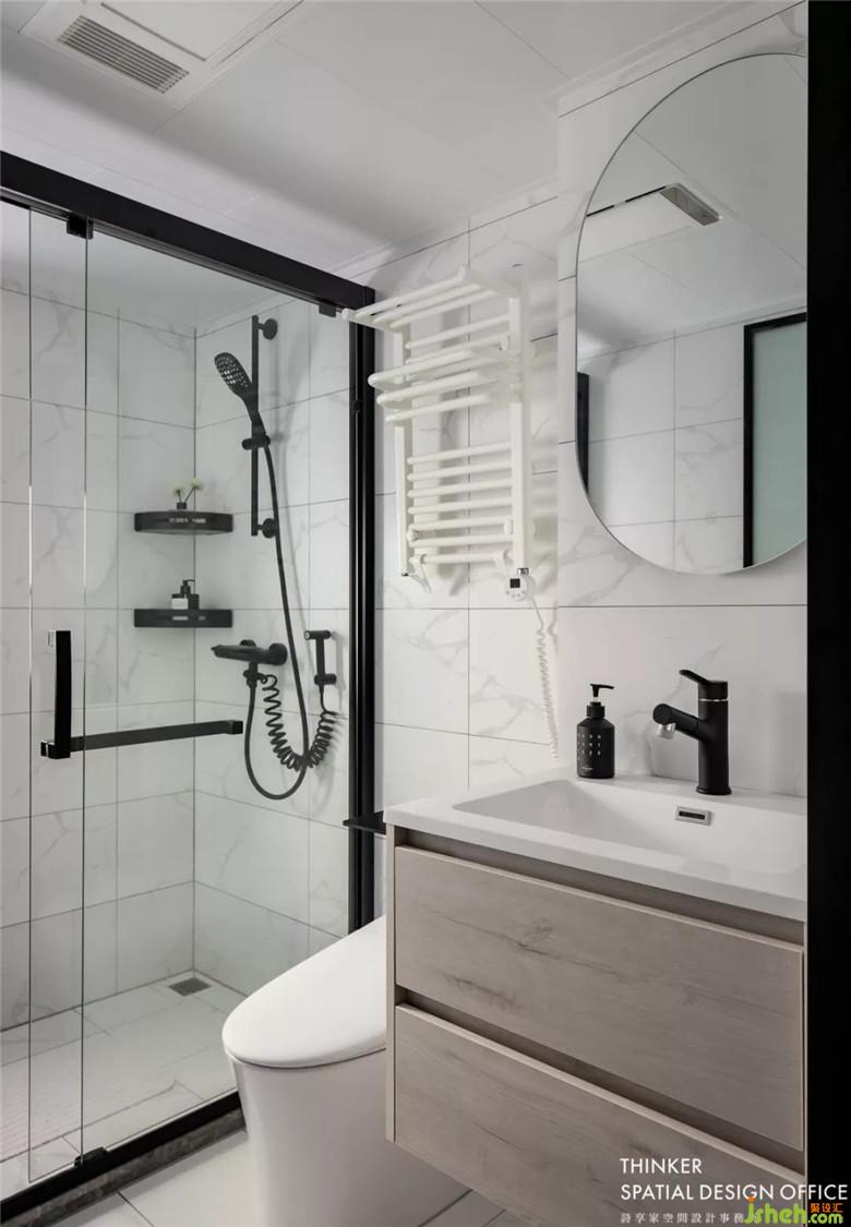 白色大理石和淺色木質(zhì)是完美搭檔,質(zhì)樸素雅,黑色五金件的點(diǎn)綴,讓衛(wèi)浴空間有了摩登的優(yōu)雅。