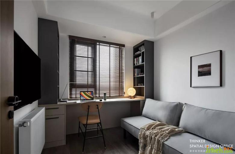 書房延續(xù)客廳黑白灰的簡約格調(diào),木色的百葉簾,隨意調(diào)節(jié)室內(nèi)光線,設置沙發(fā)床可隨時切換空間模式。