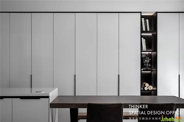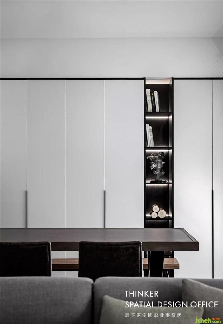 餐桌后方是極簡(jiǎn)的收納柜,極簡(jiǎn)卻不簡(jiǎn)單,雅而不俗,僅以藝術(shù)品與幾處精細(xì)花瓶點(diǎn)綴,卻足以點(diǎn)亮整個(gè)空間。