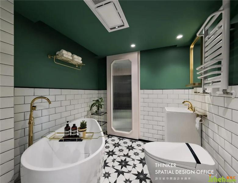 衛(wèi)生間并不大,但Shirley心心念念地想要一個(gè)有浴缸的浴室,所以特別挑選了一款小巧的蛋殼浴缸,顏值和功能兼具。同時(shí)用白色+復(fù)古綠的半墻設(shè)計(jì),清爽又摩登。