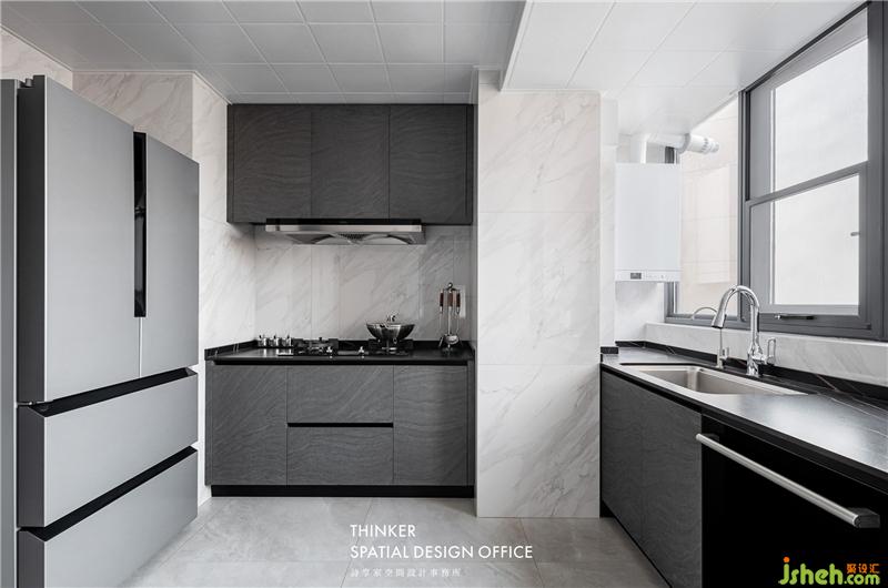 · 廚房以實用好打理為主要需求,顏色上沿用了黑白灰的配色,根據(jù)梁體布置的U型廚房,提高空間利用率,優(yōu)化烹飪動線;