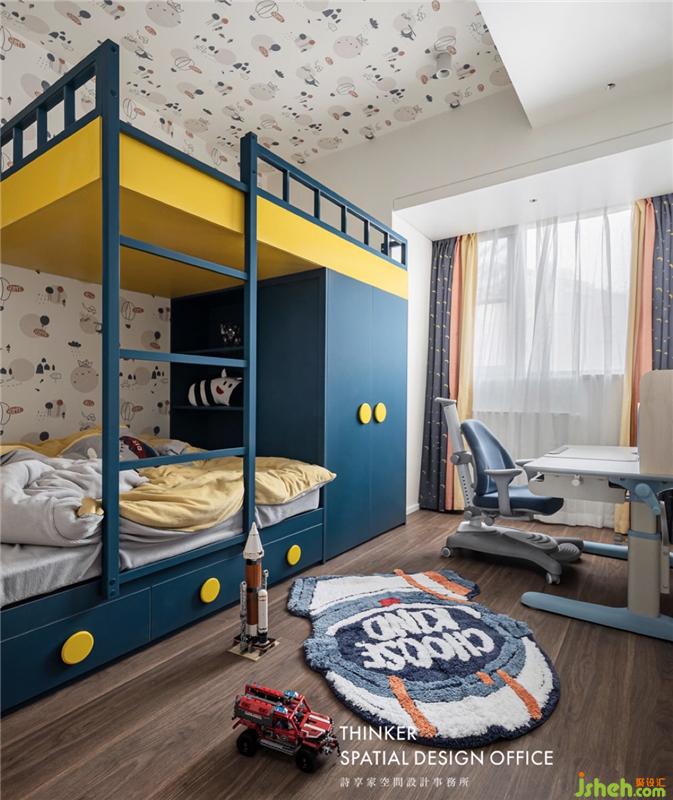 · 兒童房是承載孩子最初夢想的地方,黃色和藍(lán)色的色彩搭配讓這個空間充滿趣味。壁紙是孩子和設(shè)計師一同挑選的,白底不會讓空間壓抑,上面的卡通形象顯示著孩子內(nèi)心的天真童趣;
