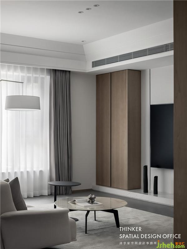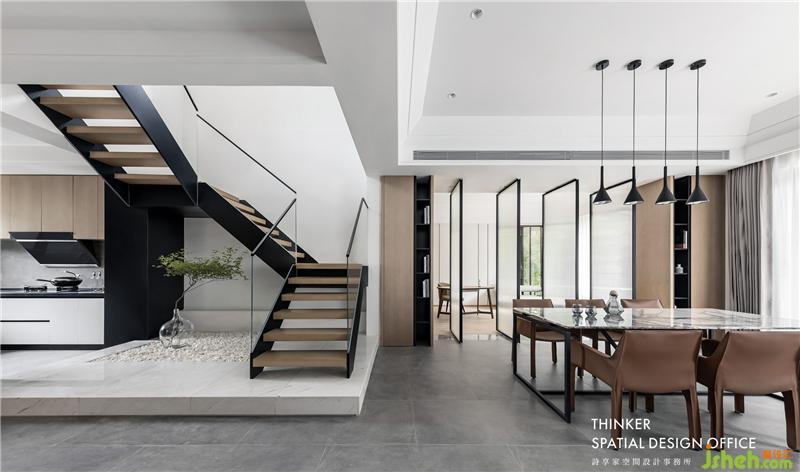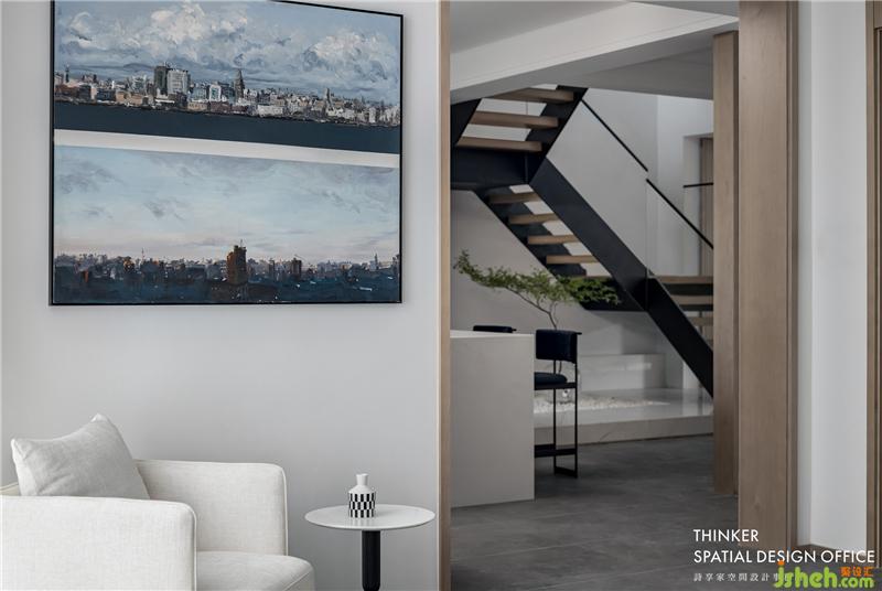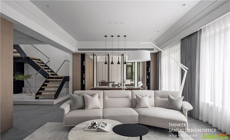 · 客廳以純凈的白色或木色為底,黑色點綴,又互相交合而成,設計師將材料、色彩、燈光等元素進行簡化,用簡潔的視覺效果營造出舒適的家居氛圍。