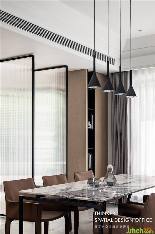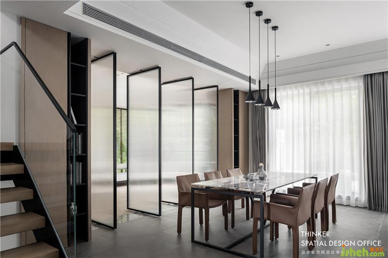 · 餐廳和書房相連,我們用多扇旋轉玻璃門作隔斷,模糊空間邊界,創(chuàng)造出實用與美感并俱的生活場景。