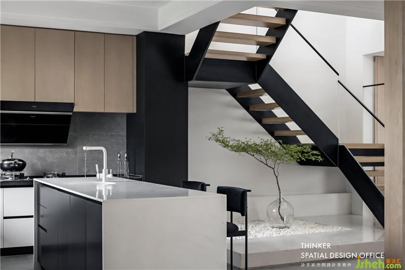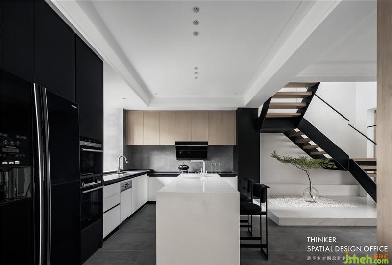 · 開放式的廚房加強了與餐廳的互動,以島臺作為隔斷減輕了視覺的厚重感。白色、黑色與原木的結合,消除了深色空間的沉悶感。