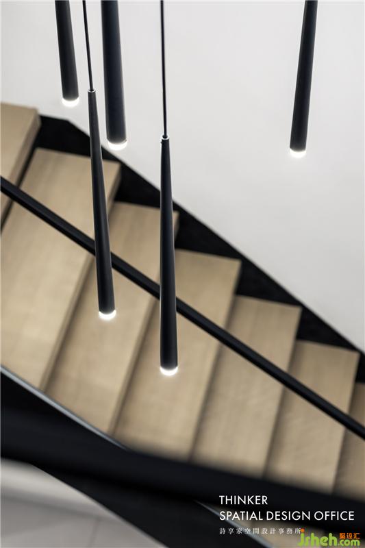 · 黑色的現(xiàn)代簡約鋼結構樓梯,配上原木色的溫潤奢雅踏板,娉婷而上,風姿綽約,這既是通往二樓的功能設計,也是一個唯美的藝術裝置。