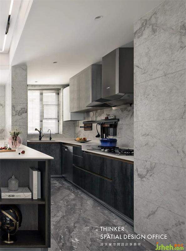拆除小陽(yáng)臺(tái),納入廚房空間,餐廚一體化設(shè)計(jì),疊加功能兼顧舒適性,讓光線更好的涌入這片天地。家人在最放松的狀態(tài)里,烹飪、聊天,享受美食,傳遞情感。
