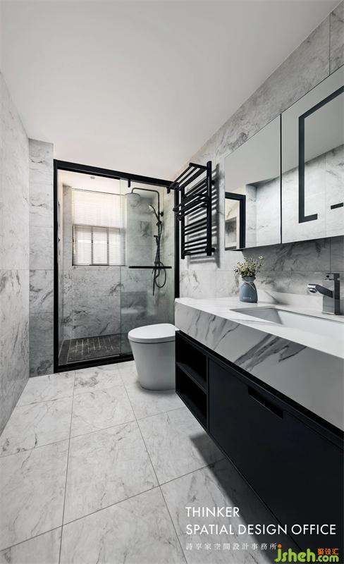 家居設(shè)計(jì)在雅白墻面磚的空間基礎(chǔ)下,通過(guò)加入黑色的淋浴房、五金掛件、洗手盆柜等組合,營(yíng)造出一個(gè)時(shí)尚高檔的黑白配空間感。