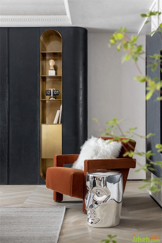 客廳往餐廳望去,金屬制成的壁爐形成空間區(qū)隔。20cm深的壁爐,輕盈不占空間,臺(tái)面上可以擺放香薰、花瓶等小物件。壁爐和鏡子同樣采用金色材質(zhì),更添精致感。