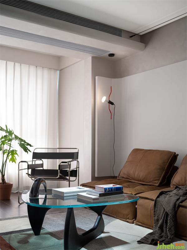 陽(yáng)臺(tái)納入客廳,經(jīng)由半透未透的紗簾過(guò)濾后的自然光落入室內(nèi),光影明暗的變化,為客廳帶來(lái)十足的韻律感。正如安藤忠雄所言:“自然光被恰當(dāng)?shù)囊脒M(jìn)來(lái),平凡的物質(zhì)也就有了生命力。”